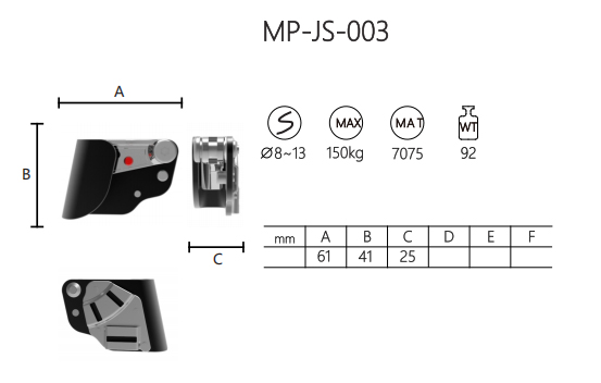 MP-JS-003 هو جهاز قوي للإمساك بالحبال مصنوع من سبائك الألومنيوم 7075، وهو مصمم للحبال التي يتراوح قطرها بين 8 - 13 ملم. تبلغ قدرتها القصوى على التحميل 150 كجم، مما يضمن أداءً موثوقًا به في تطبيقات مختلفة.