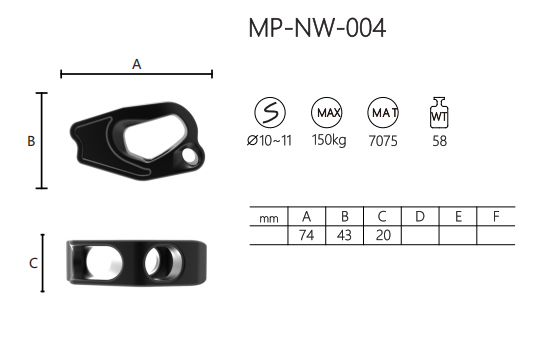 MP-NW-004 هو جهاز مناولة الحبال المصنوع من سبائك الألومنيوم 7075 والمصمم للحبال التي يبلغ قطرها من 10 إلى 11 ملم. تبلغ قدرتها القصوى على التحميل 150 كجم، مما يضمن أداءً موثوقًا به في تطبيقات مختلفة.