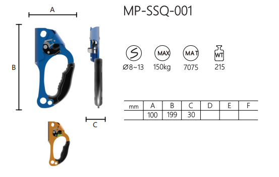 يعد جهاز MP-SSQ-001 Climbing Ascender أداة موثوقة لتطبيقات التسلق. تم تصميمه للعمل مع الحبال التي يبلغ قطرها 8 –13 ملم. مصنوع من سبائك الألومنيوم 7075، ويوفر المتانة والقوة. يبلغ وزن الصاعد 215 جرامًا، مما يجعله سهل الحمل. أبعادها هي 100 ملم طولاً (أ)، و199 ملم ارتفاعًا (ب)، و30 ملم عرضًا (ج)، مما يوفر قبضة مريحة وسهولة في التعامل. مع قدرة تحميل قصوى تبلغ 150 كيلوغرامًا، فإنه يضمن السلامة أثناء التسلق. يوفر MP-SSQ-001 حركة فعالة للحبل وتثبيتًا آمنًا، مما يجعله خيارًا عمليًا للحبال الصاعدة.