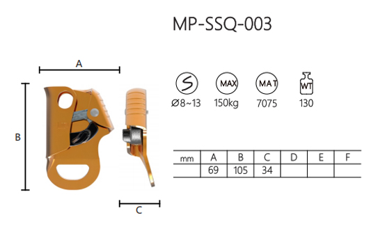 يعد جهاز إمساك الحبل MP-SSQ-003 أداة أساسية لتطبيقات التسلق والوصول إلى الحبال. تم تصميمه للعمل مع الحبال التي يبلغ قطرها 8 –13 ملم. هذا الجهاز مصنوع من سبائك الألومنيوم 7075، وهو قوي ومتين. يبلغ وزنه 130 جرامًا فقط، وهو خفيف الوزن وسهل الحمل. أبعادها هي 69 ملم طولاً (أ)، و105 ملم ارتفاعًا (ب)، و34 ملم عرضًا (ج)، مما يوفر قبضة مريحة وسهولة في التعامل. يتمتع الجهاز بقدرة تحميل قصوى تبلغ 150 كيلوغرامًا، مما يضمن السلامة أثناء التسلق. فهو يوفر حركة حبل فعالة وتثبيتًا آمنًا عند الحاجة.