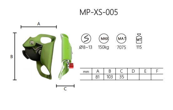 يعد جهاز الحماية MP-XS-005 جهازًا موثوقًا به للتسلق وحماية الحبل. تم تصميمه لحماية الحبال التي يبلغ قطرها 8 –13 ملم. مصنوع من سبائك الألومنيوم 7075، وهو قوي ومتين. يبلغ وزنه 115 جرامًا، وهو خفيف الوزن وسهل الحمل. أبعادها هي 81 ملم في الطول (أ)، 103 ملم في الارتفاع (ب)، و 35 ملم في العرض (ج)، مما يوفر قبضة مريحة وسهولة التعامل.