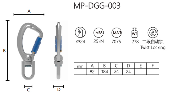 إن MP-DGG-003 عبارة عن حلقة تسلق قوية ذات قفل ملتوي مصنوعة من سبائك الألومنيوم 7075. مع درجة معالجة سطحية تبلغ 278 وقطر 24 ملم، فإنه يوفر MBS يبلغ 25 كيلو نيوتن، مما يضمن أداءً موثوقًا به في الظروف الصعبة.
