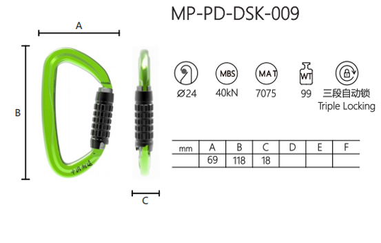 MP-PD-DSK-009 عبارة عن حلقة تسلق ثلاثية القفل عالية القوة مصنوعة من سبائك الألومنيوم 7075. تبلغ درجة معالجة سطحه 99، وقطره 24 ملم، ويوفر MBS يبلغ 40 كيلو نيوتن، مما يضمن أداءً موثوقًا به في الظروف الصعبة.