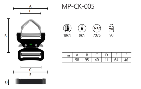 الإبزيم سريع التحرير MP-CK-005 مصنوع من سبائك الألومنيوم 7075، المعروفة بقوتها العالية ومقاومتها للتآكل. تبلغ أبعادها A 58 مم، وB 95 مم، وC 40 مم، وD 11 مم، وE 64 مم، وF 46 مم، مع علامة WT90 التي تشير إلى قدرتها على تحمل الحمل. يمكن للإبزيم أن يتحمل أحمالًا تبلغ 18 كيلو نيوتن و9 كيلو نيوتن. يسمح تصميمه القوي والمريح بالتثبيت السريع والآمن، مما يجعله مثاليًا للمعدات التكتيكية والمعدات الخارجية. يضمن البناء المتين والأداء الموثوق للإبزيم قدرته على تلبية متطلبات التطبيقات المختلفة، مما يوفر للمستخدمين حل تثبيت آمن ومريح.