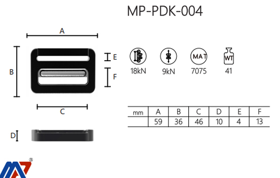 يوفر هذا الإبزيم قدرة تحميل قصوى تبلغ 18 كيلو نيوتن وحد حمل عمل يبلغ 9 كيلو نيوتن، مما يوفر قوة وأمانًا موثوقين. يبلغ طوله 59 ملم (أ)، وارتفاعه 36 ملم (ب)، مع سطح تماس بعرض 46 ملم (ج). سمكها (D) 10 مم، ولها فتحة بعرض 4 مم (E) وفتحة بطول 13 مم (F).