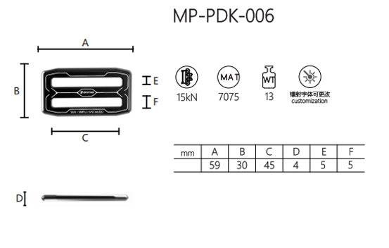 إن MP-PDK-006 عبارة عن مشبك حزام مدمج من سبائك الألومنيوم 7075 بدرجة معالجة سطحية تبلغ 13، ويدعم أحمالًا تبلغ 15 كيلو نيوتن من أجل السلامة. أبعادها 59 ملم طولاً (أ)، و30 ملم ارتفاعاً (ب)، و45 ملم عرضاً (ج)، وسمكها 4 ملم (د) وفتحاتها 5 ملم عرضاً (هـ، و). إن تصميمها المنخفض وبنيتها القوية تجعلها مثالية للأحزمة التكتيكية. يمكن للمستخدمين تخصيصه باستخدام نص محفور بالليزر.