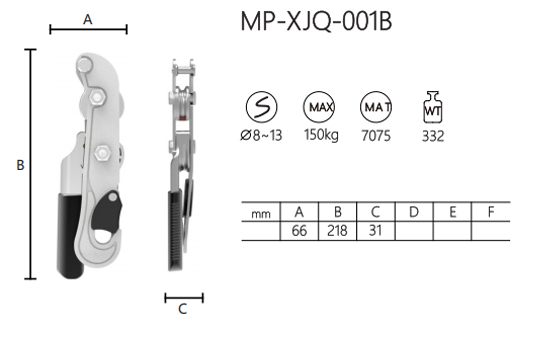تم تصنيع حبل الإمساك الصناعي MP-XJQ-001B من سبائك الألومنيوم 7075، مما يضمن المتانة والقوة. يمكنه التعامل مع حمولة قصوى تبلغ 150 كجم وهو متوافق مع الحبال التي يبلغ قطرها 8~13 ملم. الأبعاد هي A66 ملم، B218 ملم، و C31 ملم، ووزن 332 جرام. تصميمه المدمج والمحمول يجعل من السهل حمله. يوفر إمساك الحبل قبضة موثوقة وتحكمًا مستقرًا أثناء عمليات التسلق أو النزول. فهو يوفر معالجة وسلامة ممتازة، مما يجعله أداة عملية للتطبيقات الصناعية.