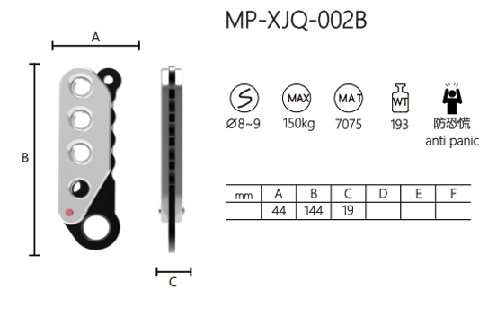 مشبك الحبل الصناعي MP-XJQ-002B مصنوع من سبائك الألومنيوم 7075. يمكنها تحمل حمولة قصوى تبلغ 150 كجم وتناسب الحبال التي يبلغ قطرها 8~9 ملم. الأبعاد هي A44 ملم، B144 ملم، و C19 ملم، ووزنها 193 جرام فقط. حجمها الصغير ووزنها الخفيف يجعلان من السهل حملها واستخدامها. بفضل تصميمه المضاد للذعر، فإنه يوفر أداءً موثوقًا ومستقرًا أثناء العمليات. يوفر مشبك الحبل قبضة وتحكمًا فعالين، مما يجعله أداة عملية للتطبيقات الصناعية.