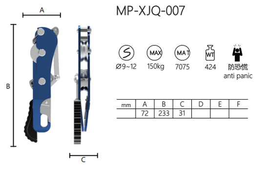 يتكون جهاز الهبوط ذو القفل التلقائي MP-XJQ-007 من سبيكة الألومنيوم 7075. وهو يدعم الحبال التي يبلغ قطرها 9~12 ملم ويبلغ حمولتها القصوى 150 كجم. يبلغ قياس الجهاز A72 ملم، وB233 ملم، وC31 ملم، ويزن 424 جرامًا. يضمن نظام القفل التلقائي ذو النقطتين نزولًا آمنًا ومستقرًا. يوفر التصميم المضاد للذعر أداءً موثوقًا وتشغيلًا سلسًا. الحجم الصغير والوزن الخفيف يجعلان من السهل حمله واستخدامه. يوفر النازل تحكمًا فعالاً أثناء الهبوط، مما يجعله أداة عملية لمختلف السيناريوهات.
