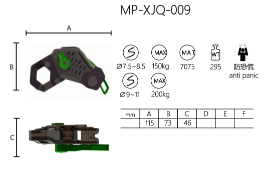 تم تصميم محدد السقوط MP-XJQ-009 باستخدام سبائك الألومنيوم 7075. وهو يدعم نطاقين لقطر الحبل: 7.5~8.5 ملم مع حمولة قصوى تبلغ 150 كجم، و9~11 ملم مع حمولة قصوى تبلغ 200 كجم. يبلغ قياس الجهاز 115 ملم في A، و73 ملم في B، و46 ملم في C، ويزن 295 جرامًا. يضمن تصميمه المضاد للذعر التشغيل المستقر والآمن. يوفر محدد السقوط أداءً موثوقًا وتحكمًا سلسًا أثناء الاستخدام. حجمها الصغير ووزنها الخفيف يجعلان من السهل حملها. يوفر الجهاز حماية فعالة في سيناريوهات السقوط، مما يجعله أداة عملية لمختلف التطبيقات.