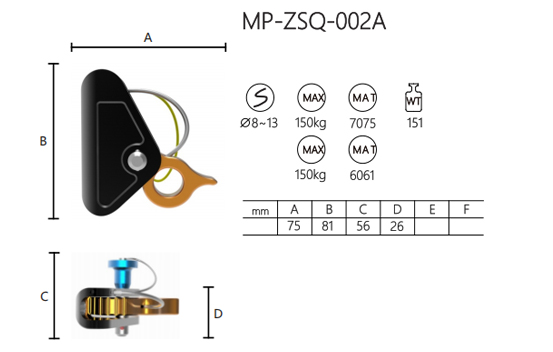 MP-ZSQ-002A هو جهاز إمساك الحبال مصنوع من سبائك الألومنيوم 7075 و6061، وهو مصمم للحبال التي يتراوح قطرها بين 8 - 13 ملم. يمكنها تحمل حمولة قصوى تصل إلى 150 كجم، مما يضمن أداءً موثوقًا به في تطبيقات مختلفة.