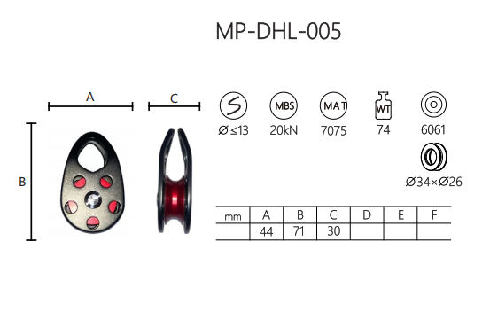 MP-DHL-005 عبارة عن بكرة مدمجة مصممة لتطبيقات التسلق. مصنوع من سبائك الألومنيوم 6061، ويجمع بين المتانة والبنية خفيفة الوزن بوزن 74 جرامًا. مع قوة كسر قصوى (MBS) تبلغ 20 كيلو نيوتن، فإنه يدعم الحبال التي يصل قطرها إلى 13 ملم.