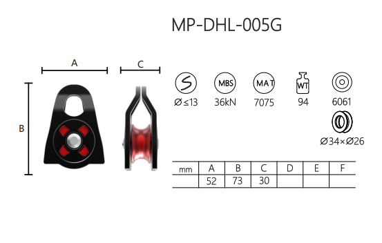 MP-DHL-005G عبارة عن بكرة مزدوجة مدمجة مصممة للتعامل الفعال مع الأحمال. مصنوع من سبائك الألومنيوم المتينة 6061، ويوفر الموثوقية مع قوة كسر قصوى (MBS) تبلغ 36 كيلو نيوتن. يستوعب حبالًا يصل قطرها إلى 13 ملم ويزن 94 جرامًا، ويجمع بين القوة والبنية خفيفة الوزن.