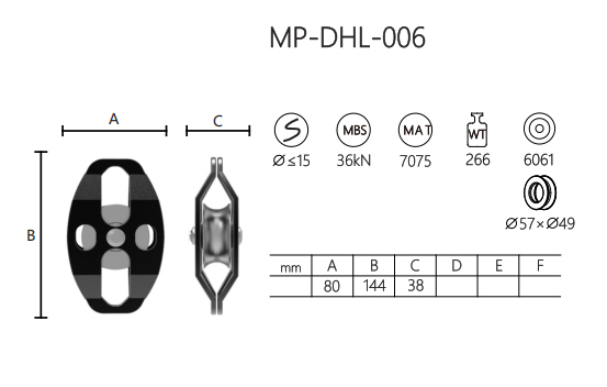 MP-DHL-006 عبارة عن نظام بكرة مزدوج الفتحة مصمم للتعامل الفعال مع الأحمال. مصنوع من سبائك الألومنيوم المتينة 6061، ويوفر الموثوقية والبناء خفيف الوزن. مع قوة كسر قصوى (MBS) تبلغ 36 كيلو نيوتن، فإنها تستوعب حبالًا يصل قطرها إلى 15 ملم. يزن 266 جرامًا، ويوازن بين المتانة وقابلية النقل.