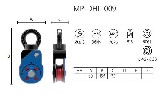 MP-DHL-009 عبارة عن نظام بكرة مزدوجة مدمج مصمم للتعامل الفعال مع الأحمال. مصنوع من سبائك الألومنيوم 6061، ويوفر المتانة مع الحفاظ على وزنه الخفيف عند 315 جرامًا. مع قوة كسر قصوى (MBS) تبلغ 36 كيلو نيوتن، فإنها تستوعب حبالًا يصل قطرها إلى 13 ملم.