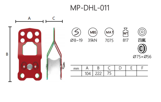 MP-DHL-011 عبارة عن مكون نظام بكرة أحمر مصنوع من سبائك الألومنيوم 7075 مع أربع طبقات من الفلور. يبلغ طوله (أ) 104 ملم، وارتفاعه (ب) 222 ملم، وسمكه (ج) 75 ملم. تتميز البكرة بحزم يبلغ قطرها 75 ملم وعرضها 56 ملم، وهي مناسبة لأقطار الحبال التي تتراوح من 8 ملم إلى 19 ملم. يبلغ وزنه 817 جرامًا، ويبلغ MBS 39 كيلو نيوتن. تم تصميم MP-DHL-011 لتطبيقات التسلق حيث يكون تحمل الأحمال بكفاءة والحركة السلسة أمرًا بالغ الأهمية.