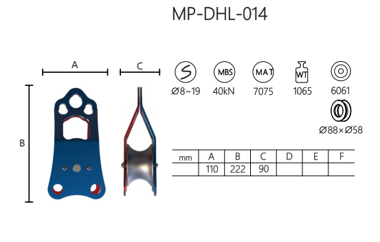 MP-DHL-014 عبارة عن بكرة تسلق مصنوعة من سبائك الألومنيوم. يبلغ طوله (أ) 110 ملم، وارتفاعه الإجمالي (ب) 222 ملم، وعرضه (ج) 90 ملم. تتميز البكرة بحزم يبلغ قطرها 88 ملم وعرضها 58 ملم. وهي مصنوعة من سبائك الألومنيوم 7075 و 6061. يحتوي المكون على MBS يبلغ 40 كيلو نيوتن وهو مناسب لأقطار الحبال التي تتراوح من 8 مم إلى 19 مم. يبلغ وزنه 1065 جرامًا، وهو مصمم للتشغيل السلس والمتانة. يعد MP-DHL-014 مناسبًا لتطبيقات التسلق حيث يكون تحمل الأحمال بكفاءة والحركة السلسة أمرًا بالغ الأهمية.
