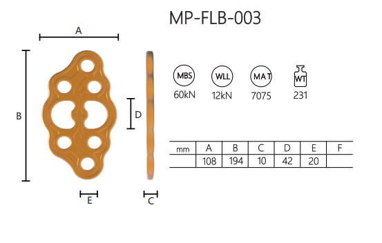 MP-FLB-003 عبارة عن لوحة توزيع قوة صفراء ذات فتحات متعددة. يبلغ طوله (أ) 108 ملم، وعرضه (ب) 194 ملم، وسمكه (ج) 10 ملم، وقطر الفتحة (د) 42 ملم، ومسافة الفتحة (هـ) 20 ملم، ويزن 231 جرامًا. تتميز اللوحة بـ MBS 60kN و WLL 12kN، مما يشير إلى قدرتها على تحمل الأحمال. مصنوع من سبائك الألومنيوم 7075، ويوفر القوة والمتانة. تم تصميم MP-FLB-003 لتوزيع القوة بالتساوي، مما يجعله مناسبًا لتطبيقات الرفع أو التجهيز حيث تكون هناك حاجة إلى نقاط اتصال متعددة. وتسمح فتحاتها المتعددة بالمرونة في ربط المعدات، مما يضمن توزيع الحمل بشكل آمن وفعال.