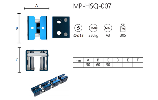 MP-HSQ-007 عبارة عن سلسلة كهربائية مصنوعة من الفولاذ A3. تبلغ حمولتها القصوى 350 كجم وتعمل بحبال يصل قطرها إلى 13 ملم. يبلغ قياس السلسلة A50 مم، وB60 مم، وC50 مم، وتزن 305 جرامًا. يضمن هيكلها القوي أداءً موثوقًا به. توفر السلسلة الكهربائية تشغيلًا سلسًا وسهولة في التعامل، مما يجعلها مناسبة لمختلف مهام الرفع والتحريك. يوفر تصميمه المتين خدمة طويلة الأمد، بينما يعزز الحجم الصغير والوزن الخفيف قابلية النقل والراحة.