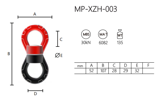 MP-XZH-003 عبارة عن وصلة دوارة مصنوعة من سبائك الألومنيوم 6082. تبلغ MBS 30 كيلو نيوتن وحمولة قصوى تبلغ 300 كجم. يبلغ قياس الوصلة A52 مم، وB107 مم، وC28 مم، وD29 مم، وE32 مم، بوزن 135 جرامًا. حجمها الصغير ووزنها الخفيف يجعلان من السهل حملها والتعامل معها. يوفر الرابط الدوار تشغيلًا سلسًا واتصالات موثوقة، مما يضمن أداءً مستقرًا أثناء الاستخدام. يسمح تصميمه المتين باستخدامه لفترة طويلة في تطبيقات مختلفة.
