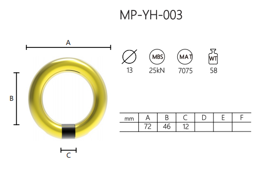 MP-YH-003 عبارة عن حلقة دائرية مصنوعة من سبائك الفولاذ الصفراء ذات أبعاد وعلامات محددة. يبلغ قطرها الخارجي (أ) 72 ملم، وقطرها الداخلي (ب) 46 ملم، وسمكها (ج) 12 ملم. تحتوي الحلقة على عدة نقوش: MP-YH-003 في الأعلى، إلى جانب الرموز والقيم التي تشير إلى MBS 25kN وMAT 7075 وWT 58. من المحتمل أن تشير هذه العلامات إلى مواصفات المواد وتقييمات القوة والتفاصيل الفنية الأخرى ذات الصلة بتطبيقها. يشير تصميم الحلقة إلى أنها مصممة للاستخدامات الصناعية أو الميكانيكية، ربما كمكون في الآلات أو الأنظمة الهيكلية حيث تكون مثل هذه المواصفات ضرورية للتشغيل الآمن والفعال. قد يكون اللون الأصفر بمثابة معرف مرئي أو لأغراض مقاومة التآكل. يبدو أن MP-YH-003 عبارة عن جزء مصمم بدقة ومخصص لمتطلبات هندسية محددة.