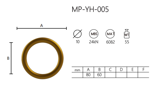 MP-YH-005 عبارة عن حلقة دائرية سلسة ذات أبعاد وعلامات محددة. يبلغ قطرها الخارجي (أ) 80 ملم، وقطرها الداخلي (ب) 60 ملم. تحتوي الحلقة على عدة نقوش: MP-YH-005 في الأعلى، وأربعة رموز ذات قيم مقابلة —MBS 24kN، وMAT 6082، وWT 55. بالإضافة إلى ذلك، هناك دائرة مشطوبة بداخلها الرقم 10. من المحتمل أن تشير هذه العلامات إلى مواصفات المواد وتقييمات القوة والتفاصيل الفنية الأخرى ذات الصلة بتطبيقها. يشير تصميم الحلقة إلى أنها مصممة للاستخدام الصناعي أو الميكانيكي، ربما كمكون في الآلات أو الأنظمة الهيكلية حيث تكون مثل هذه المواصفات ضرورية للتشغيل الآمن والفعال. قد يكون لونه الذهبي بمثابة معرف مرئي أو لأغراض مقاومة التآكل. يبدو أن MP-YH-005 عبارة عن جزء مصمم بدقة ومخصص لمتطلبات هندسية محددة.