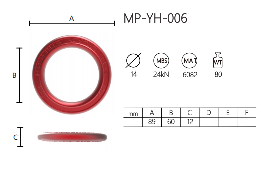 MP-YH-006 عبارة عن حلقة دائرية من الفولاذ الأحمر ذات أبعاد وعلامات محددة. يبلغ قطرها الخارجي (أ) 89 ملم، وقطرها الداخلي (ب) 60 ملم، وسمكها (ج) 12 ملم. تحتوي الحلقة على عدة نقوش: MP-YH-006 في الأعلى، وأربعة رموز بقيم مقابلة—MBS 24kN، وMAT 6082، وWT 80. بالإضافة إلى ذلك، هناك دائرة مشطوبة بداخلها الرقم 14. من المحتمل أن تشير هذه العلامات إلى مواصفات المواد وتقييمات القوة والتفاصيل الفنية الأخرى ذات الصلة بتطبيقها.