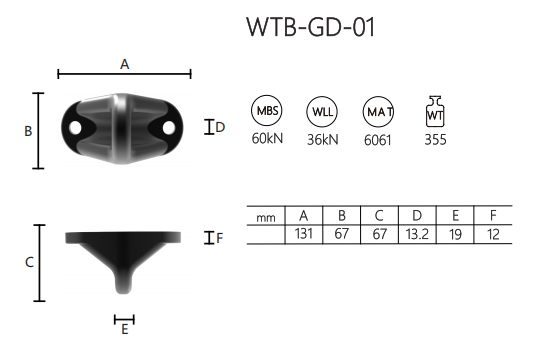 WTB-GD-01 عبارة عن لوحة توزيع قوة مصنوعة من الألومنيوم ذات أبعاد وعلامات محددة. يبلغ طوله (أ) 131 ملم، وارتفاعه (ب) 67 ملم، وسمكه (ج) 19 ملم. تتميز اللوحة بقطر (D) يبلغ 13.2 ملم، وعرض (E) يبلغ 19 ملم، وقياس إضافي (F) يبلغ 12 ملم. يتضمن المكون النقوش: WTB-GD-01 في الأعلى، بالإضافة إلى الرموز والقيم التي تشير إلى MBS 60kN، وWLL 36kN، وMAT 6061، وWT 355.